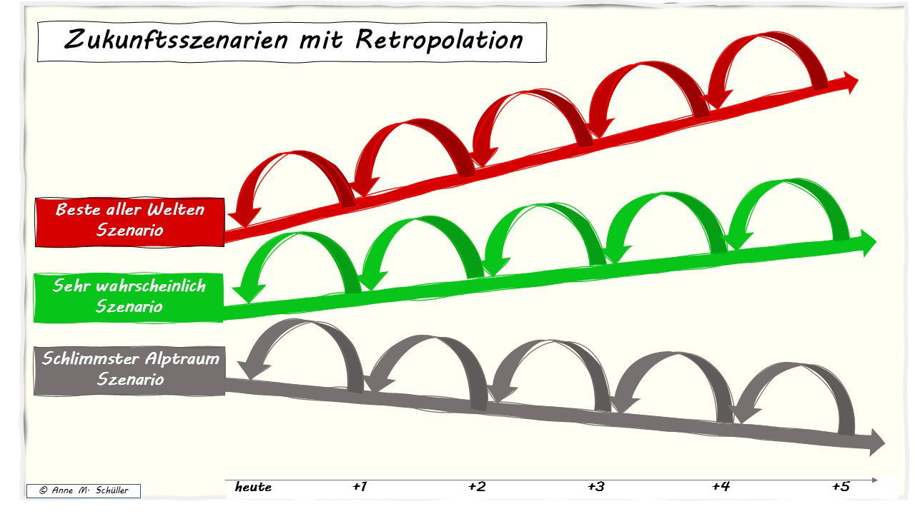 Zunächst geht es nun um das Zukunftszielbild des Unternehmens, sprich, welche Idealpositionierung es in der betrachteten Zukunft haben will. Daraus wird die Zukunftsstrategie abgeleitet. Dann werden die Etappenschritte definiert, die nötig sind, um die anvisierten Ziele zu erreichen. Um nicht der Gefahr zu erliegen, die Zukunft aus der Vergangenheit und Gegenwart heraus einfach fortzuschreiben, bedienen wir uns der Retropolation, auch Backcasting oder Regnose genannt.